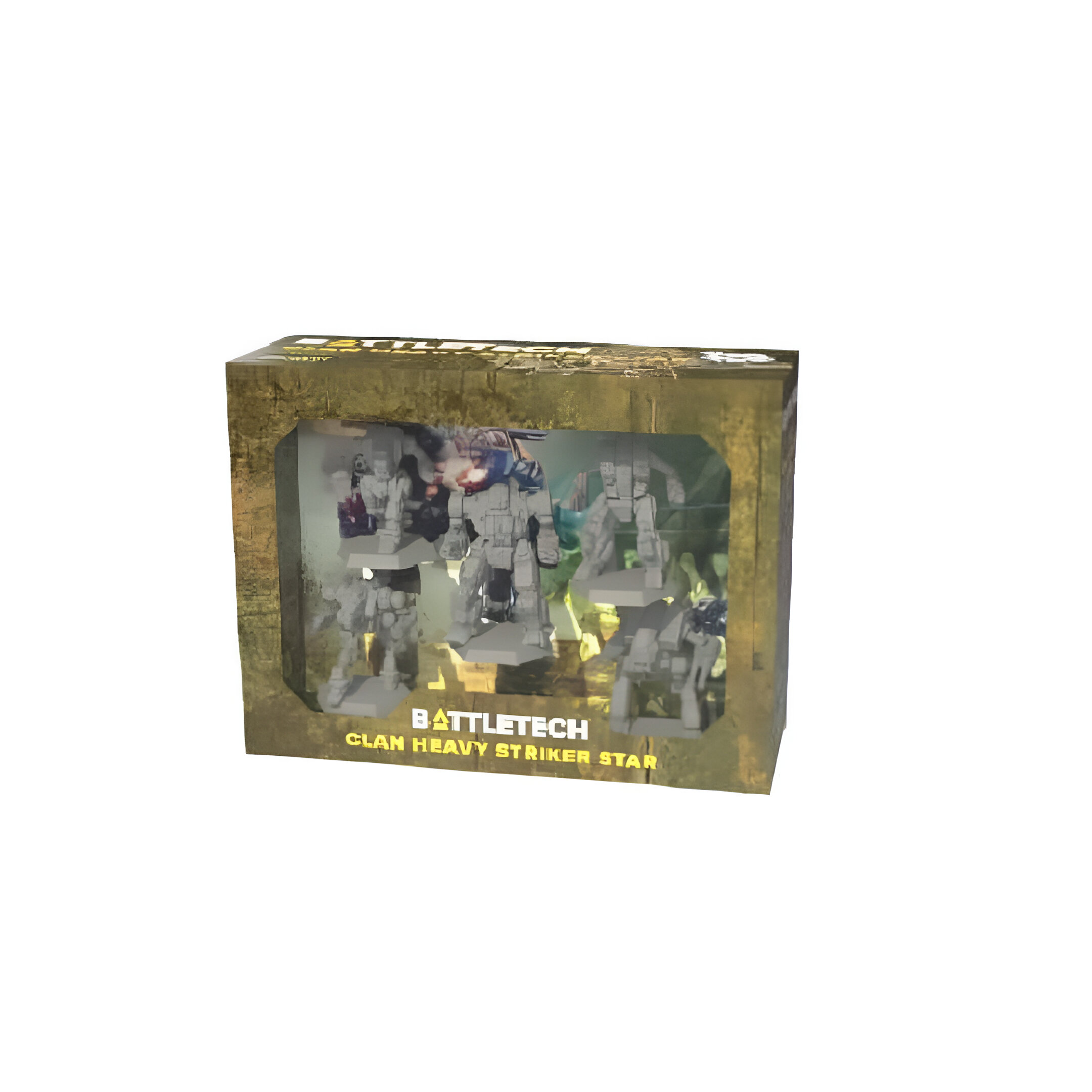 Unleash the Clan Heavy Battle Star on your enemies! Turkina, Kingfisher, Huntsman, Ebon Jaguar, and Crossbow—no assembly required—along with five MechWarrior pilot cards and five Alpha Strike cards.