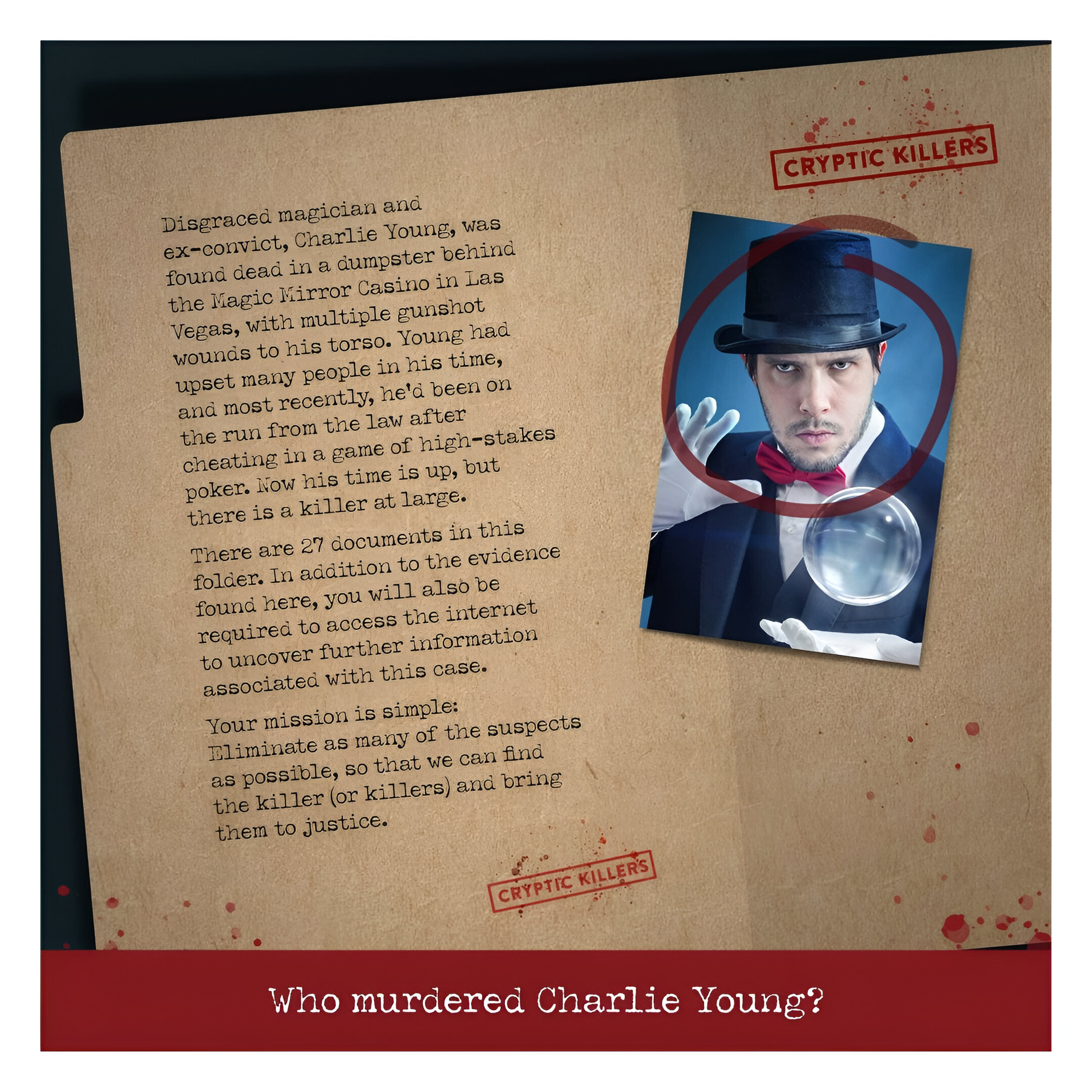 Disgraced magician and ex-convict, Charlie Young, was found dead in a dumpster behind the Magic Mirror Casino in Las Vegas, with multiple gunshot wounds to his torso. Young had upset many people in his time and most recently, he’d been on the run from the law after cheating in a game of high-stake poker. Now his time is up, but there is a killer at large. The evidence has been collected for you, it’s your job to piece it all together and work out who it was that killed the victim.