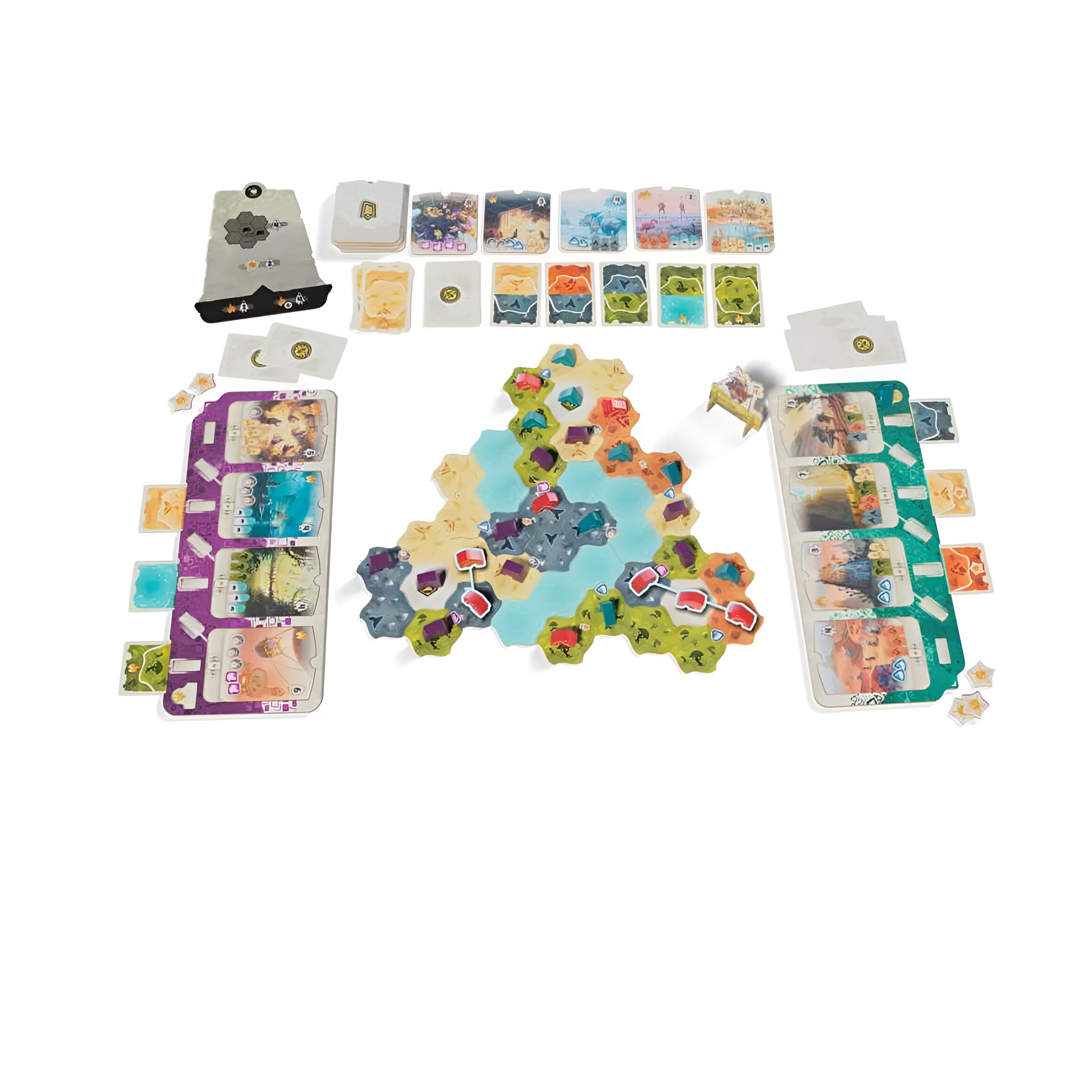 Dewan is a fast-paced, competitive area-placement game for 2-4 players that features racing, placement, and hand strategy. During play, you collect terrain cards and spend them to strategically place your camps on the territory. Make the best use of terrain and resources so that you can satisfy the requirements on your story tiles. Along the way, gather berries and master fire to earn additional points.