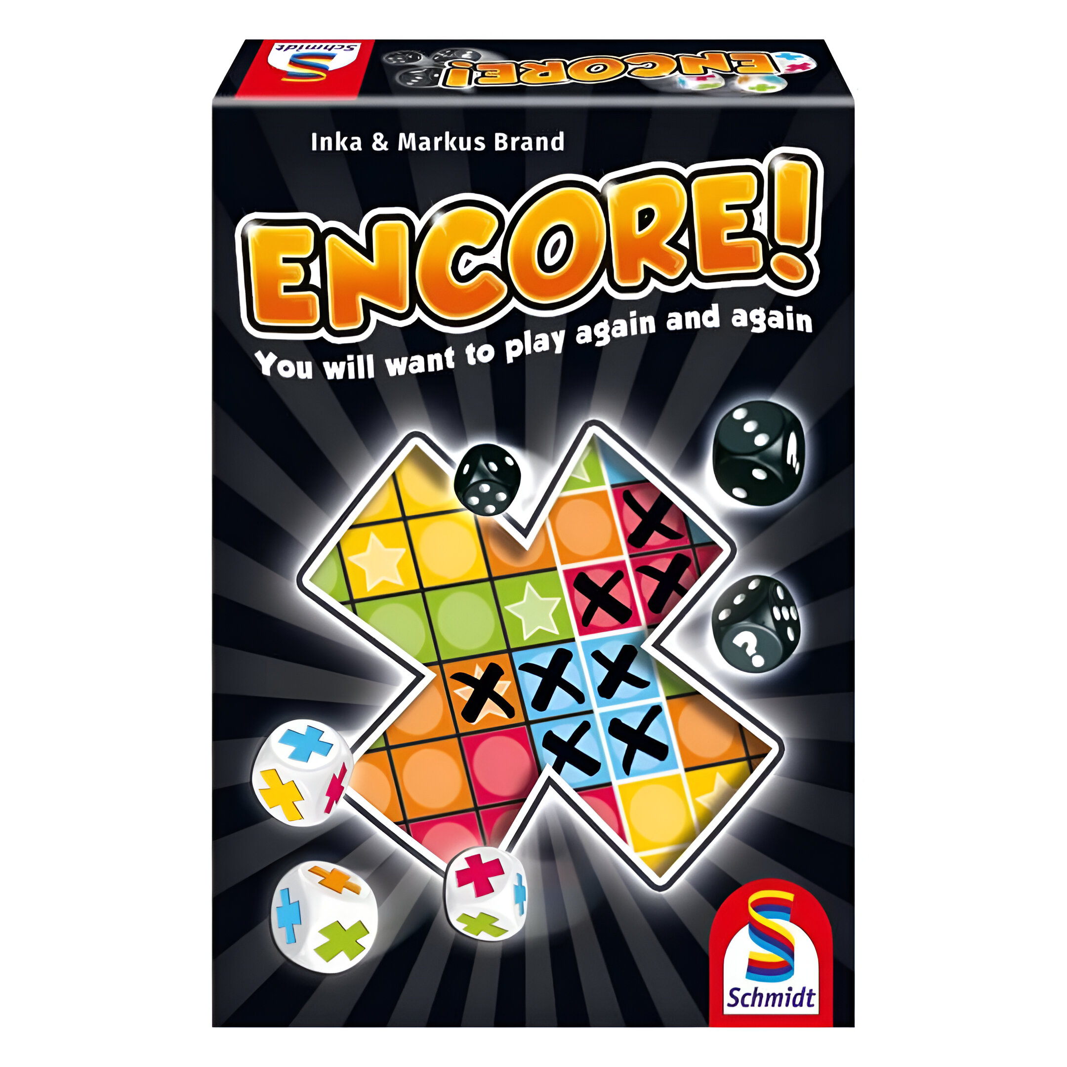 Score bonus points by being the first to check off all boxes in a column, and all boxes of the same colour. Work your way out from the centre with careful choices of dice to build your points. Will you score big enough to earn an Encore?