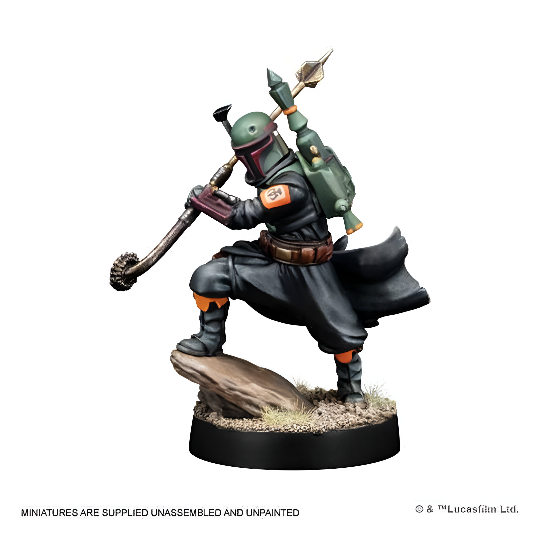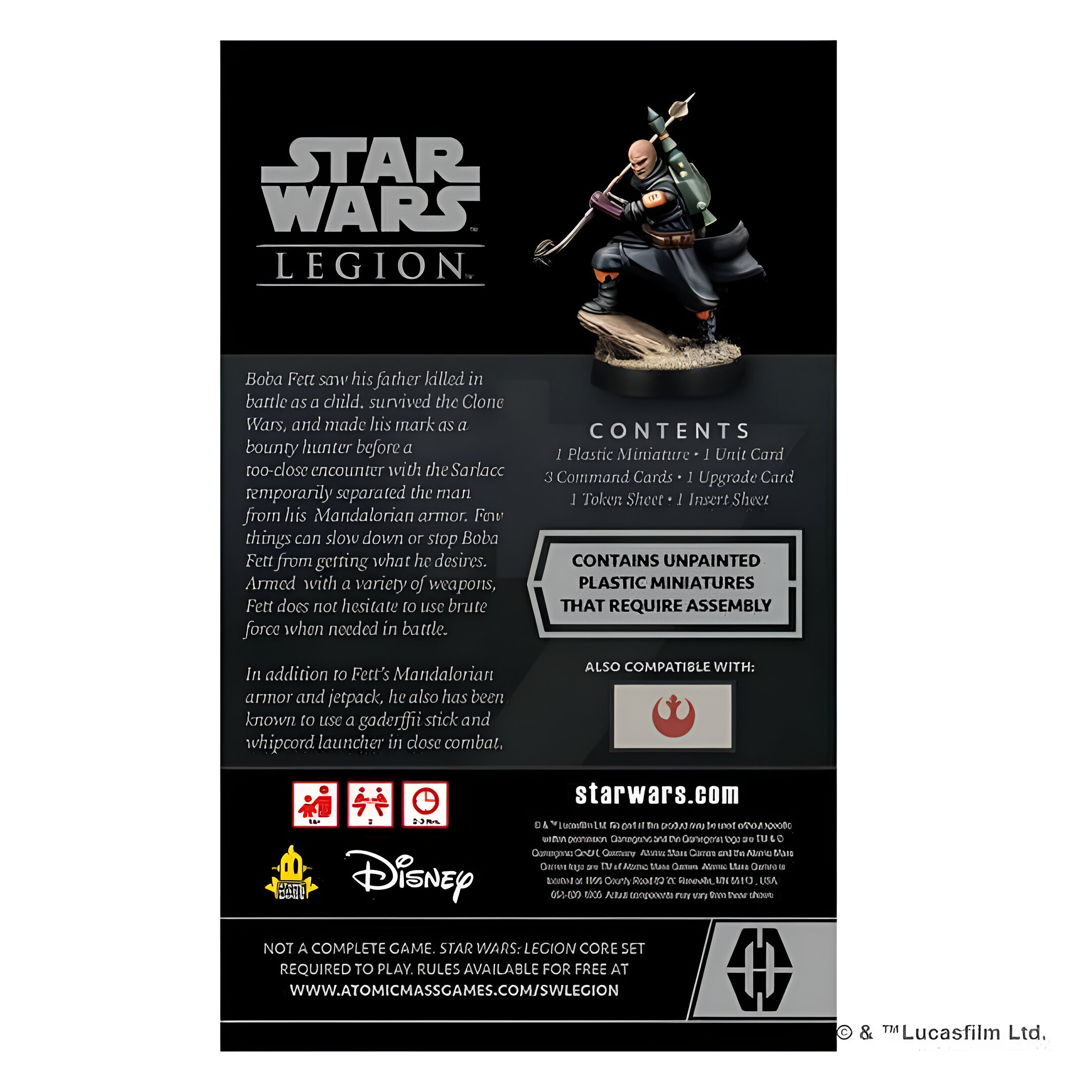 The infamous Boba Fett returns to Star Wars: Legion in this new Operative Expansion! Featuring a new version of this iconic character based on his appearance in The Mandalorian and The Book of Boba Fett, this expansion gives players powerful new Operative that can fight alongside their mercenary and Rebel forces. The beautifully sculpted Boba Fett miniature found in this expansion menaces his foes with his gaderffii stick and can be assembled with our without his Mandalorian helmet. Additionally, players will find three command cards that make Boba Fett even more versatile in combat. Finally, an upgrade card allows players to invite Boba Fett with his Flame Projector for even more firepower.